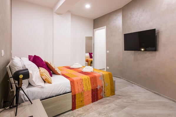 In the sleeping area, double bed, walk-in wardrobe useful for storing personal items and possibility of adding a cot on request. The bathroom, with shower, is very spacious and equipped with a courtesy kit for each guest.