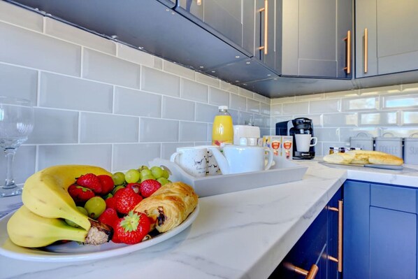 The kitchen is well-equipped with everything required for holiday dining including a fridge/ freezer, and enough cutlery, crockery and glasses for everyone staying. There is also a washing machine available for guests to use.