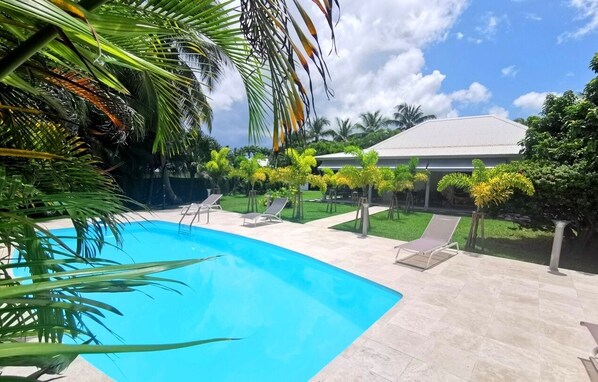 Tuin / terras: 30 m² terras met hangmatten en buitenlounge compleet voor maaltijden of ontspanning. De tuin van 800 m² volledig omheind, zonder tegenover, heeft schijnwerpers en 2 straatverlichting om meer van uw avonden en de verlichte tropische tuin te genieten.
