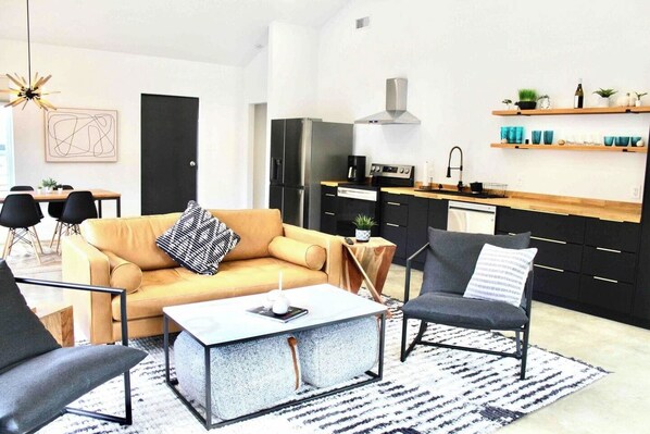 Fotogalerie voor Relax on 3 peaceful acres at this Modern Rustic Barndominium in Nocona. This 2BR, 2BA retreat offers an open layout, chef’s kitchen, spa-style baths, and outdoor patio with fire pit—perfect for families, couples, or friends under the Texas stars.