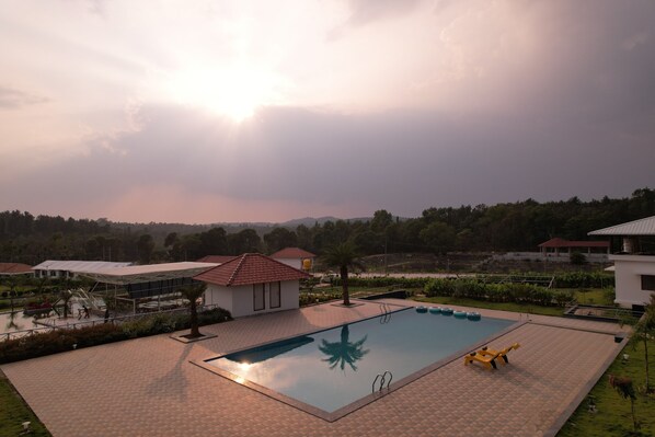 Resort met een buitenzwembad en een restaurant in Sakleshpur