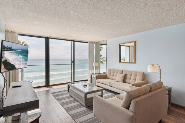 Step into a spacious and sunlit living area adorned in soothing blues and cheerful yellows. Relax on comfortable couches while enjoying the panoramic views of the Pacific Ocean through floor-length windows. Slide open the glass door to access brand-new balconies, creating the perfect spot to savor the sea breeze. An entertainment center with a TV completes this inviting space, ensuring moments of relaxation after a day at the beach.