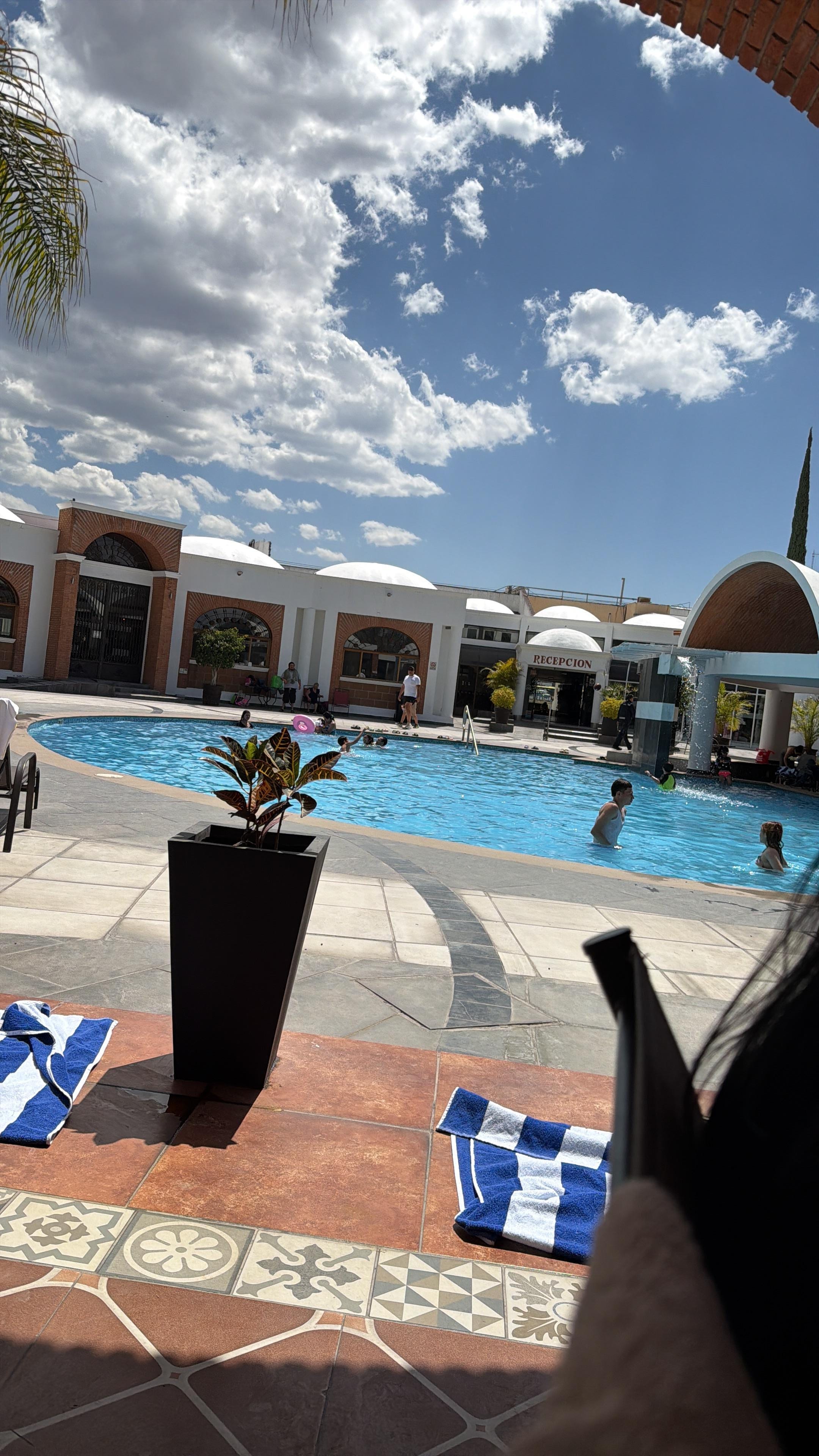 Supuestamente a las 3 pm estaba mi reservación y el cuarto me lo entregaron hasta las 4:30 pm , pero cuando deje la habitación me tardé 15 minutos 1:15 pm y ya querían cobrarme 500 pesos de mas un señorita , güera , joven pero de muy mal carácter , dijo si no me trae la llave de inmediato le cobraré 500 y porque ayer que me entregó el cuarto casi una hora y media tarde nadie le cobró aparte dijo que no encontraba mi ine que dejé para las toallas y ahí estaba ,tuve que buscarla personalmente , la alberca está el agua helada no ganas de meterse , por la alberca hay un área de comer y pregunté si podía sentarme y me dijeron si no consume no puede sentarse nunca en ningún hotel me había pasado , no hay camastros muy descepcionado , el cuarto huele a hospital yo creo trapean con el