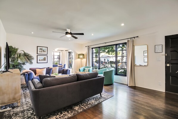 Maak een reis terug in de geschiedenis en ervaar dit onlangs gerestaureerde pand, gebouwd in 1937 op een dubbele brede kavel met prachtige hardhouten vloeren, uitzonderlijk mooie periode geselecteerde meubels, patio's en een extreem grote achtertuin met fruit- en avocadobomen. Meer dan 800 vierkante meter aan overdekte leefruimte!