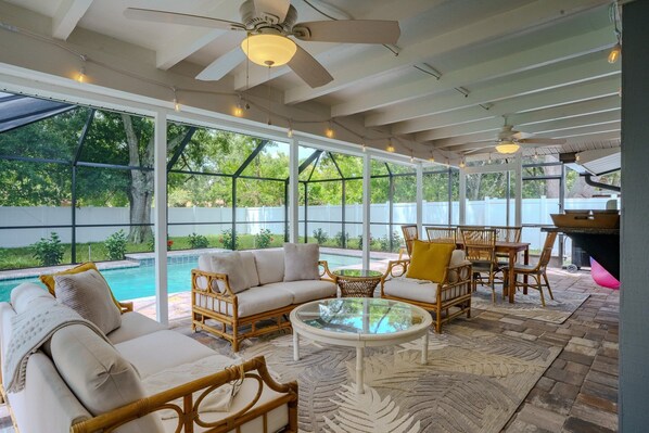 Experience the beauty of Florida's outdoors in the comfort of the screened-in lanai and pool deck. It's the perfect spot for morning coffees or evening cocktails, free from the concerns of the elements. The pool is heated and features a shallow ledge perfect for lounging or young children enjoying the pool.