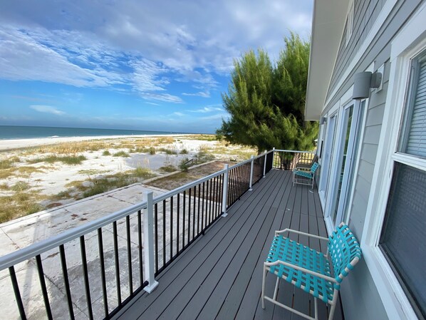 Dit prive en rustige drie slaapkamers, twee badkamers huis rust op een ruim terras met uitzicht op de Golf van Mexico. Elke kamer met strandthema is comfortabel, privé en ontspannend. Loop naar buiten naar het witte zandstrand om te rusten en te zwemmen. Of kom tot rust op het balkon en geniet van het adembenemende uitzicht op de duinen en het blauwe water.