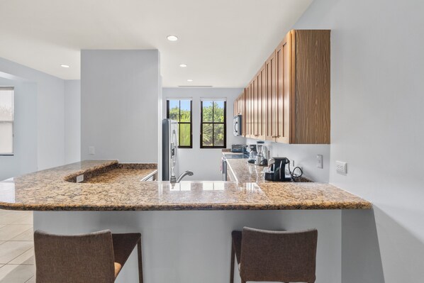 This condo is beautifully decorated and has been updated with stainless steel appliances and granite countertops. The master has a king-size bed with an en-suite bathroom. The second bedroom has a queen bed. The third bedroom has two twin beds.  The unit can comfortably sleep 6.  It also features in-suite laundry and a large, covered terrace with a dining table for 4.