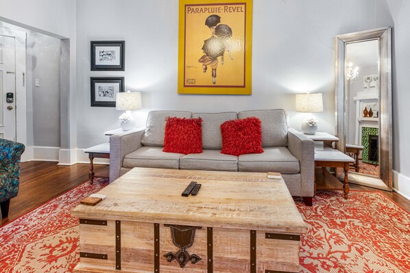 Loop naar je luxe appartement en zoek naar nummer 11. Een dubbele keyless entry vanaf de straat houdt dit appartement veilig en beveiligd. Twee Lucky-gasten hebben alles wat ze nodig hebben om een schoon en comfortabel verblijf te hebben in het hart van alles. Betreed de woonruimte met hoge plafonds en veel natuurlijk daglicht. Een flatscreen-tv staat tegenover de bank voor late shows of vroege ochtendnieuws. Neem elke ochtend de tijd en brouw een pot koffie in de ruime grote keuken. Geniet van het koken tijdens het reizen? Roestvrijstalen apparaten en aanrechtbladen van het slagersblok maken koken en opruimen een koud kunstje.