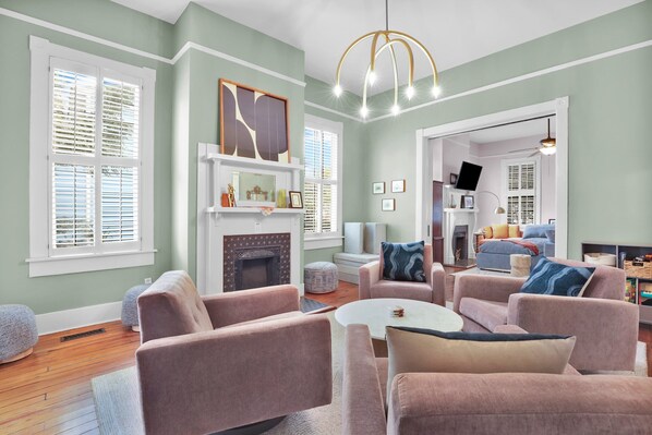De formele salon veranderde ontspannen woonruimte is de perfecte plek om te verzamelen voor het diner. Gasten zullen genieten van de Smart TV aan de muur en het omliggende uitzicht op het charmante centrum. Aangrenzend is de eetkamer, met een antieke tafel die plaats biedt aan acht personen. De onlangs gerenoveerde keuken (compleet met ontbijthoek en wijnkoelkast) is volledig uitgerust met roestvrijstalen apparatuur en voldoende aanrechtruimte.