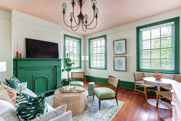 Welcome to The Jungle—a vibrant, design-forward retreat above historic Habersham Street in the heart of Savannah’s Landmark District. Just a half-block from Bay Street, this 3-bedroom, 1-bathroom hideaway blends 1852 charm with bold jungle wallpaper, leafy murals, and quirky Southern flair.