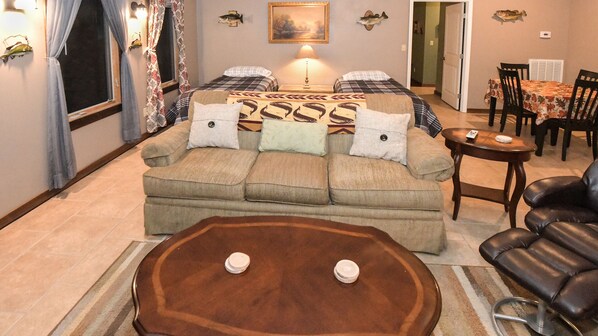 Lunker Lodge is de perfecte plek om te ontspannen als je niet op het meer. Het is groot op meer dan 1400 sqft en een comfortabele plek om rond te hangen met een sofa, 2 relaxfauteuils, een sterk onbeperkt gratis WIFI-signaal en een 55-inch HDTV met DirecTV! U kunt genieten van een maaltijd st de eettafel of meer terloops op het eiland in de keuken.