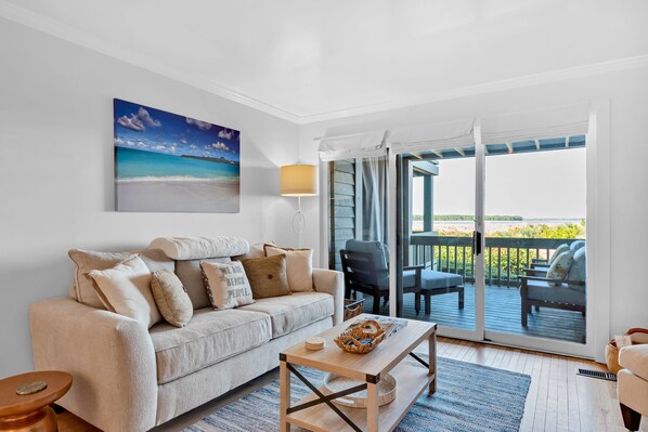 Enter this villa to an open living area. Beautiful wood floors run throughout each room. The kitchen is fully stocked for all your cooking needs. The quartzite counters and white subway tile are clean and modern. There are stainless steel appliances and custom cabinets. A dining table easily seats six. Plus you have two counter stools which let you be a part of the meal preparation in the kitchen. The great room is anchored by sliding doors leading to the deck. You have a 60" TV available to stream all your favorites. A queen sleeper sofa can be used for any extra overnight guests. Head out to the covered deck and feel the warm sun and feel the low country breezes blow by. The deck comfortably seats three in the large teak chairs. A perfect spot for an afternoon nap, morning coffee or afternoon cocktail.