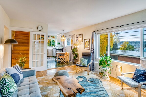Along with unique art and splashes of color, this classic, two-story home also features a number of modern amenities to ensure you have a memorable vacation here in the Emerald City. Prepare anything from your morning coffee (with the help of the Breville espresso machine) to full-course dinners in the well-equipped, full kitchen with stainless steel appliances. Gather together for movie nights in the cozy living area with a gas fireplace and a Netflix-equipped flatscreen TV, or head out back and relax on the furnished balcony with a local microbrew in-hand. And upstairs, you'll find a bonus room with another flatscreen TV, shelves of books, and a desk and chair if you need to get a little work done (or do some remote schooling).