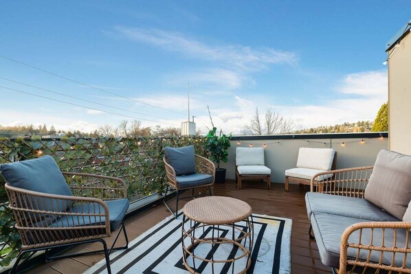 **Home Highlights** • Kitchen is fully stocked with kitchen appliances, cookware, silverware, servingware, spices, keurig coffee & tea • Rooftop patio with comfortable outdoor furniture • High quality bed, mattress, pillows & linens for comfortable sleeping • Onsite washer and dryer for your laundry needs