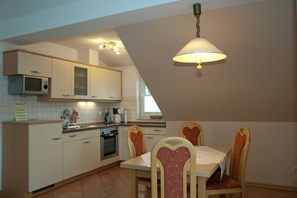 Vakantieappartement III: Het appartement III is geschikt voor maximaal 6 personen. Kenmerken: - Appartement met 3 kamers (55 m²) - Niet-roken - Ideaal voor 2 - 4 volwassenen / kinderen - Geïntegreerde kitchenette van hoge kwaliteit met elektrische kookplaat (keramische kookplaat, oven), magnetron, koffiezetapparaat , Waterkoker, broodrooster, evenals verschillende keukengerei, koelkast met vriesvak, vaatwasser dinette voor 2 - 6 personen-flatscreen-tv, dvd-speler, stereo-WLAN beschikbaar en inbegrepen- badkamer met douche / toilet en wastafel, handdoek radiator tweepersoonsbed, kinderkamer ( Bedden gescheiden) - Parkeerplaats voor 1 auto per appartement- Babybedje / reiswieg, kinderstoel voor gratis gebruik beschikbaar- Uitleenmogelijkheid voor fietsen op zijn plaats