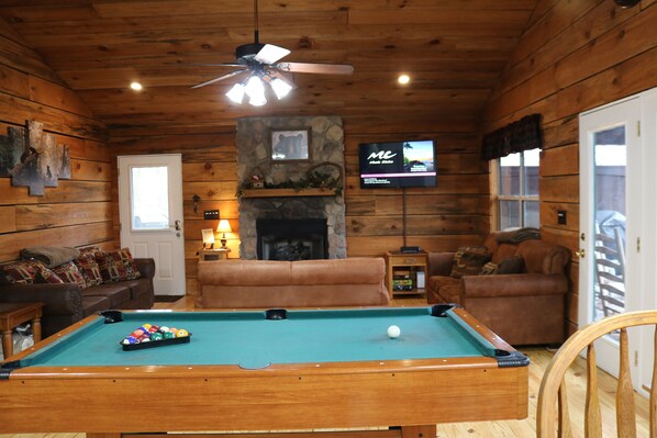 The warm, rustic, wood interior and decor provide the complete cabin experience. We have comfortable sitting room furniture, with two sofas and a loveseat. We’ve also added extras to add to your enjoyment--play a game of pool, cards, or board games; relax by the natural stone gas fireplace; enjoy watching your favorite TV show on the large HDTV, or surf the internet with our high-speed WIFI.