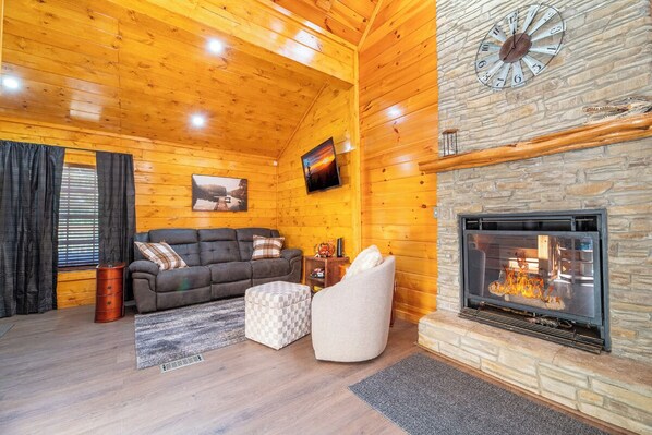 As you step inside, you’ll be greeted by the welcoming ambiance of the cabin's main living area, where rustic charm meets modern convenience. The living room is centered around a propane fireplace, perfect for curling up on cool mountain evenings. With plush seating and a large flat-screen TV, this space is perfect for relaxing after a day of exploring the Smokies. The living area flows seamlessly into the fully equipped kitchen and dining space where all the essential appliances and cookware are right at your fingertips. Head upstairs to the spacious loft and be amazed by the inviting atmosphere that combines comfort and entertainment, featuring two cozy beds for extra guests, a lively arcade game machine, and a foosball table that promises hours of fun for everyone. Free WiFi is also available throughout the property.