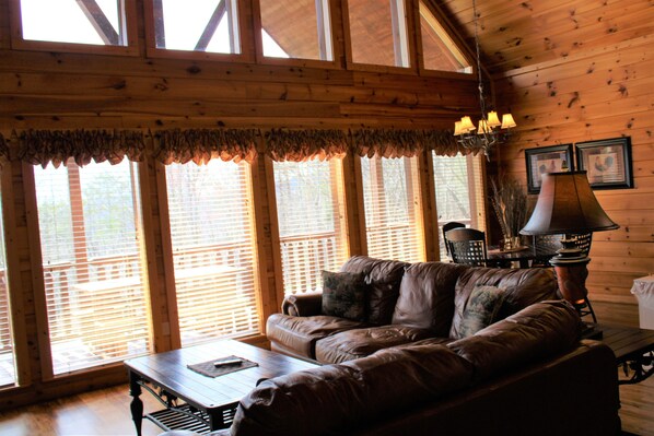 The cathedral ceiling in the great room lends an airy feeling to the cabin, with floor to ceiling windows so you can enjoy the beautiful mountain view in any weather. The leather sofa and love seat are very soft and comfortable. There is a stacked stone, gas log fireplace to enjoy on cool autumn and winter nights, while the central heat and air keeps the cabin at just the right temperature year round. The dining table for 4 is conveniently located next to the windows, so you can enjoy the view while eating. We also have a 2 person breakfast bar in the kitchen, and a log style picnic table on the deck.