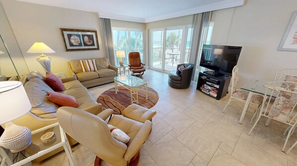 The living room contains soft leather couches and a recliner chair, three reading lamps, and a 46-inch, flat-screen remote-control cable television. One couch is a queen-sized sleeper sofa. The elegant glass dining table seats six. The kitchen, with its beautiful granite countertops, is open to the living area and the beach view. Each bedroom has its own flat screen TV. Both bathrooms have beautifully designed walk-in showers with built-in seats and sliding glass doors.