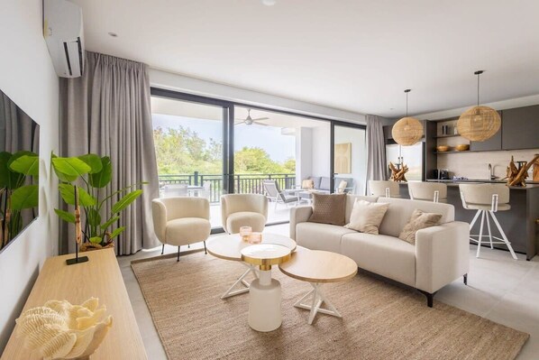 The apartment has a high-quality kitchen with essentials like a refrigerator, microwave, and dishwasher. The living area offers plush seating and sofas, ideal for unwinding while watching the smart TV or exploring various entertainment options, Savour the Caribbean evening breeze on your balcony, which presents a delightful view. The unit includes two comfortably air-conditioned bedrooms with a queen-size bed.
