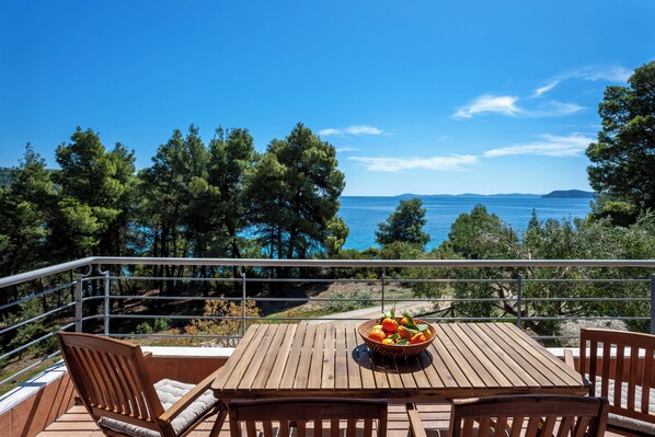 Ideal for families, and groups of friends, the maisonette can sleep up to 8 people. BBQ facilities are available at the house/balcony as well as a fully equipped kitchen. Perfect for those who need a more independent choice of accommodation for their holidays than a hotel. Just 2-3km out of the village and away from the crowds, but next to amazing beaches such as Lagomandra, Kalogria, Koviou, Agios Ioannis, steps away from a small beach, and just under the pinetrees, with stunning sea view you can stay at a home with all amenities and facilities.