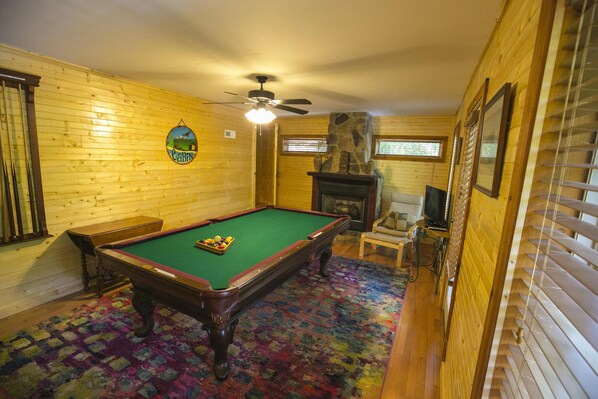 The downstairs is a Game Room has a Slate Pool Table, Flat screen Satellite TV, and large windows to take in the scenery while staying cozy and shooting pool. The Game Room also has a queen bed and has an adjacent full bathroom. Please be considerate of our pool table by never: setting drink glasses down on it, using it for dining or beer pong, or attempting to move it so everyone can enjoy it.