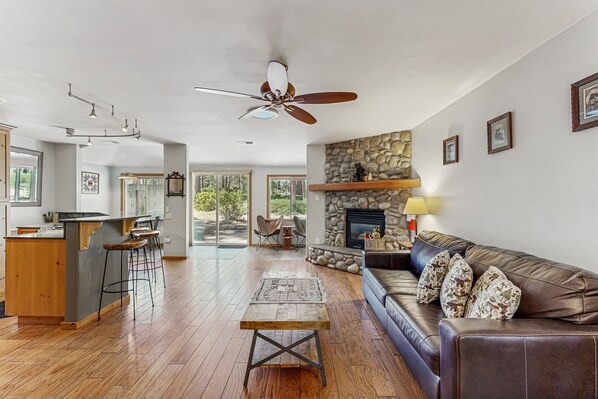 The updated open-concept kitchen is a highlight of this lovely home, featuring modern appliances and ample space for meal preparation. Gather around the dining area or relax in the cozy living room, complete with a gas fireplace and a striking rock wall surround, perfect for unwinding after a day of adventure. The home is dog-friendly, making it an ideal getaway for families traveling with pets.