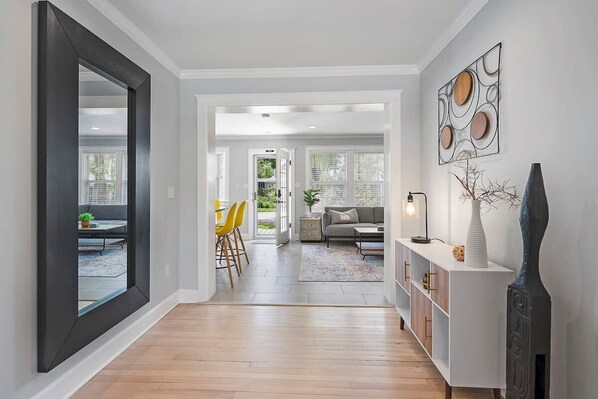 THE SPACE: This wonderful home sleeps 6 in 2 King beds and 1 Queen bed. There is a pack n play and high chair for an infant/toddler to come along as well, however the space is not child-proofed. The kitchen is equipped to cook together for a great night in! The TV is a smart TV, so simply login to your Netflix, Hulu or HBO account to enjoy your favorite movies and shows. The guest bathroom is equipped with a shower/tub combo for your ease and has a stackable washer/dryer as well as iron and ironing board. Linens and towels are provided.