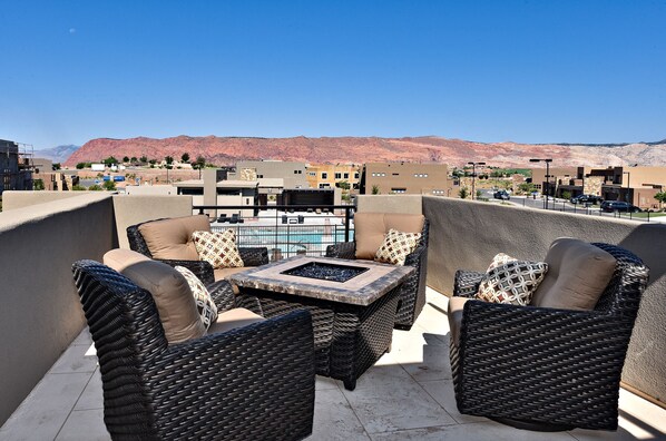 Privébalkon met zitgelegenheid in de openlucht, lounge stoelen, Firepit