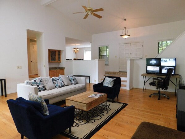 Open woonkamer met dakraam en gewelfde plafonds