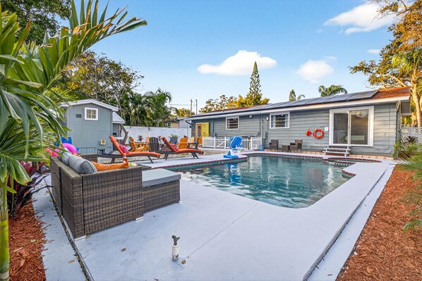 Escape to this entertainment-filled retreat in Largo, FL—perfect for families and groups! This 5-bedroom, 3-bath home features a heated pool, hot tub, outdoor shower, fire pit, BBQ grill, sun loungers, and beach essentials. Enjoy mini golf, a pool table, life-sized Connect 4, arcade games, and a gaming console. Smart TVs in every bedroom plus the bar and upstairs game room, fast WiFi, and stylish outdoor furniture make this the ultimate Florida getaway.