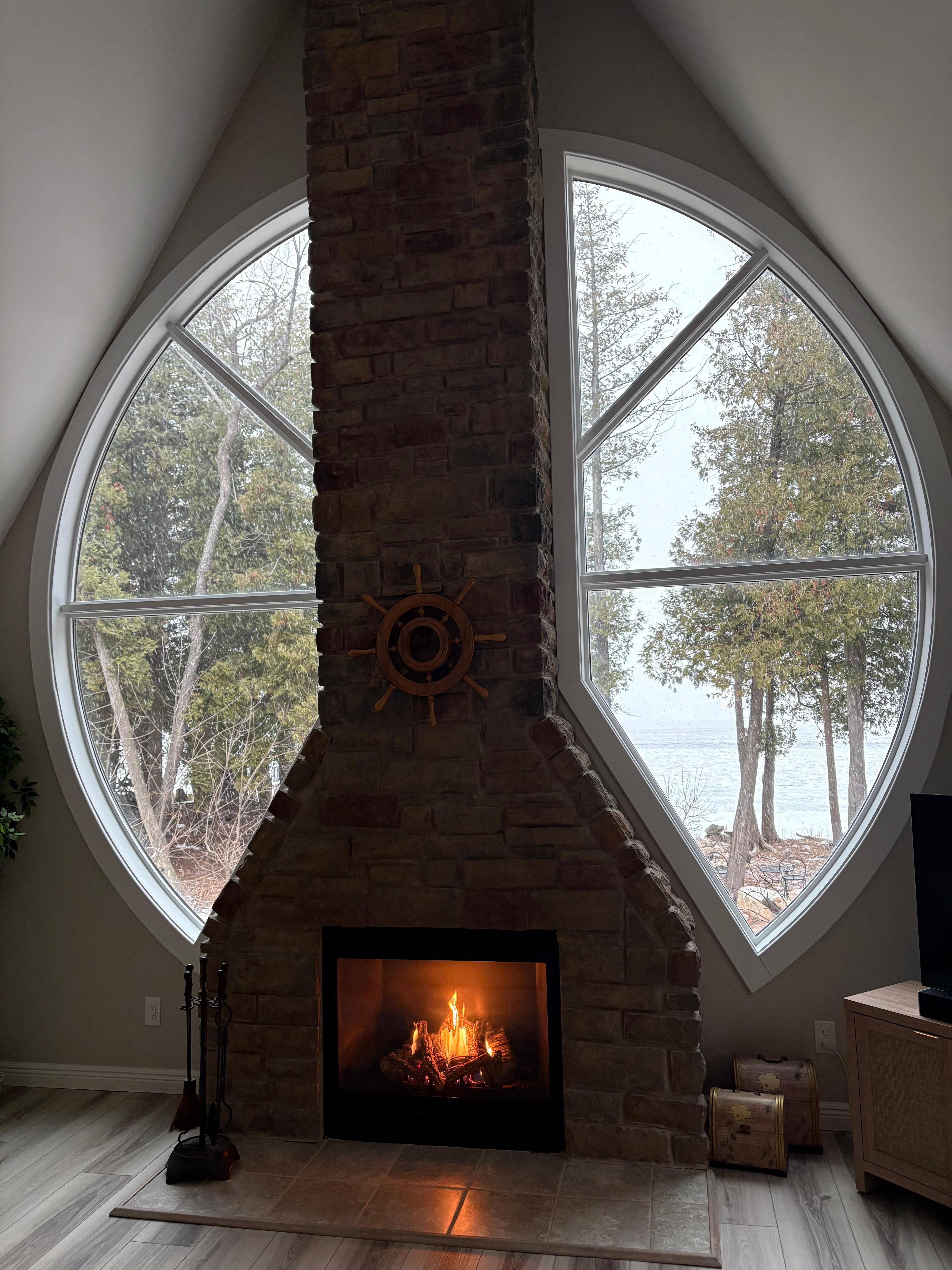 ☀ Open-concept living area with cozy gas fireplace and water views
