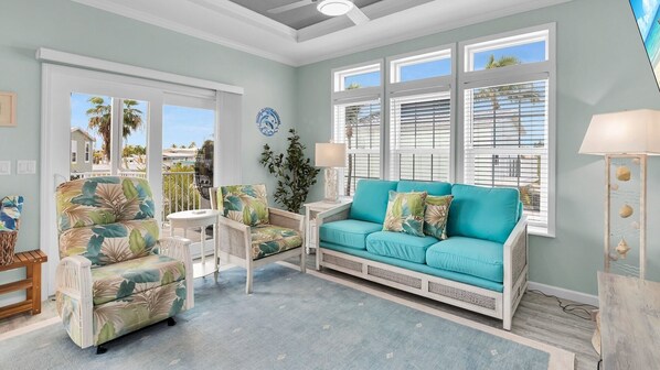 Entering through the large sliding glass doors, the warm pastel colors of the open living area welcome you to DOLPHIN DAYDREAMS. The living room features a 75 inch flat screen TV and offers plenty of comfortable seating options. The fully equipped kitchen has new stainless-steel appliances and every tool needed to prepare home cooked meals. The kitchen bar provides indoor dining. Step out to the covered patio for a BBQ of your fresh catch using the propane grill and dining set with seating for 4. DOLPHIN DAYDREAMS is elevated 12 feet off the ground, which requires the use of stairs for entry. However, a unique feature of this home is the exterior lift, allowing for easy cargo access to the home without having to carry heavy items up the stairs.