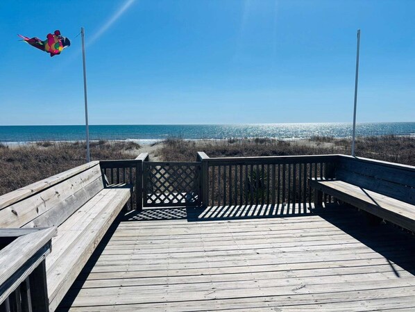 Fantastisch familiehuis aan de oceaan! Geniet van de twee overdekte portieken, compleet met rockers en een schommel. De promenade naar het strand heeft een zonneterras in de duinen met ingebouwde zitplaatsen voor een handige plek om de kinderen in de golven te zien spelen. De oceaan veranda beschikt over privacy rolluiken. Ruime woon / eetkamer / keuken inclusief aanrecht. Vier slaapkamers, drie volledige badkamers, WiFi, 3 tv's, buitendouche, parkgrill. Alles wat u nodig heeft voor een onvergetelijke familievakantie! Linnengoed verstrekt op wekelijkse verhuur. Houd er rekening mee dat de open haard op de foto's momenteel niet kan worden gebruikt.