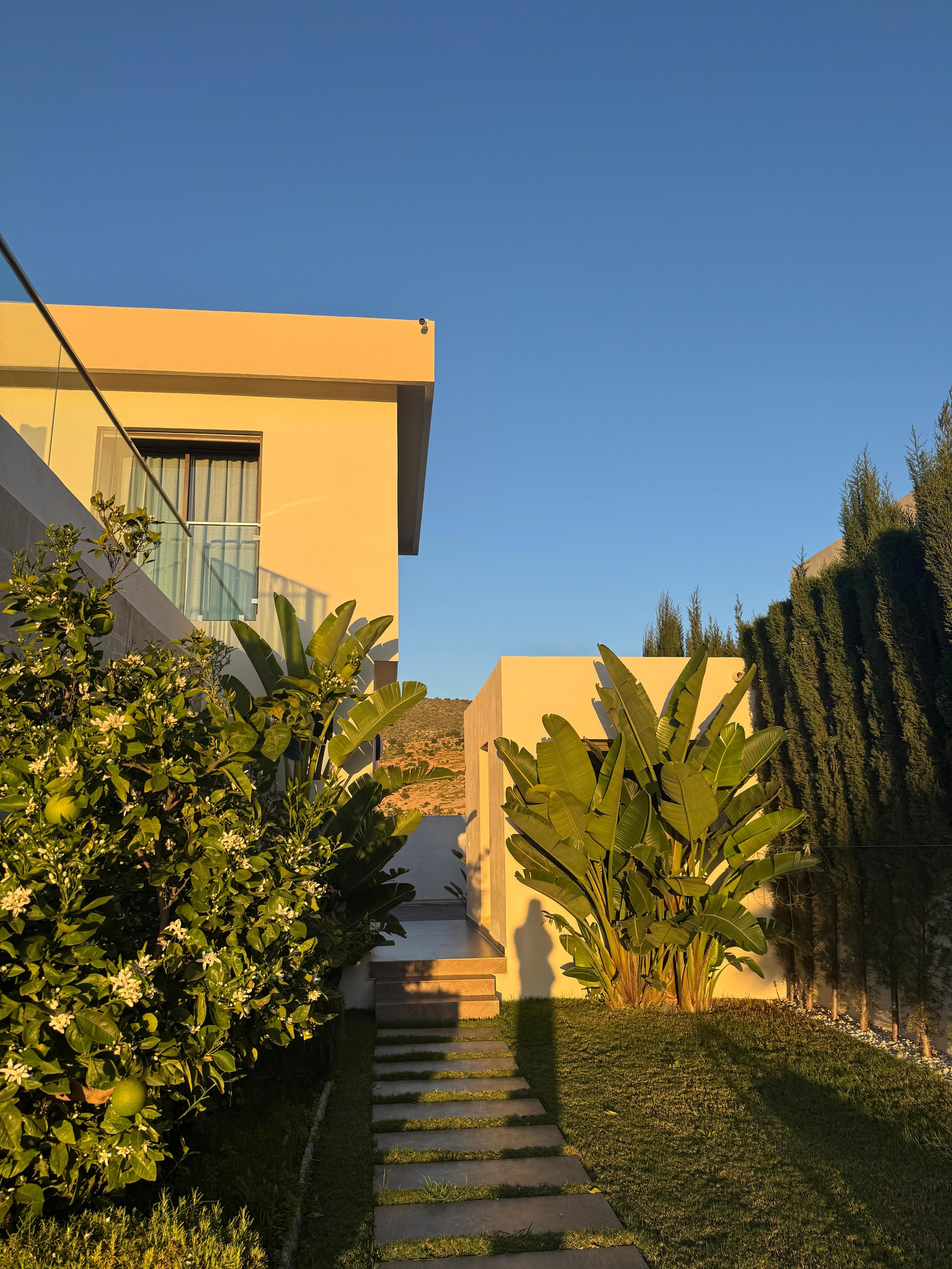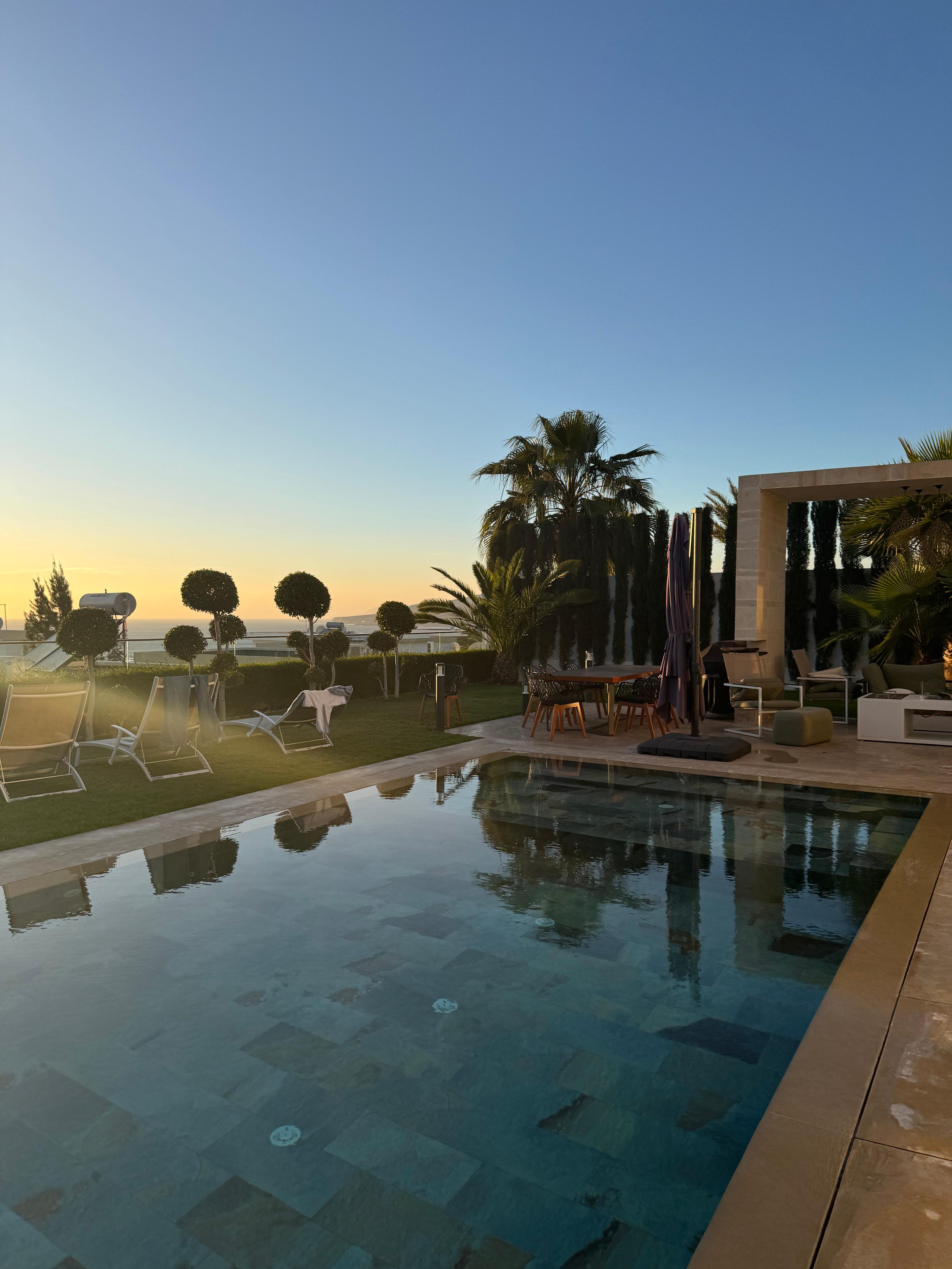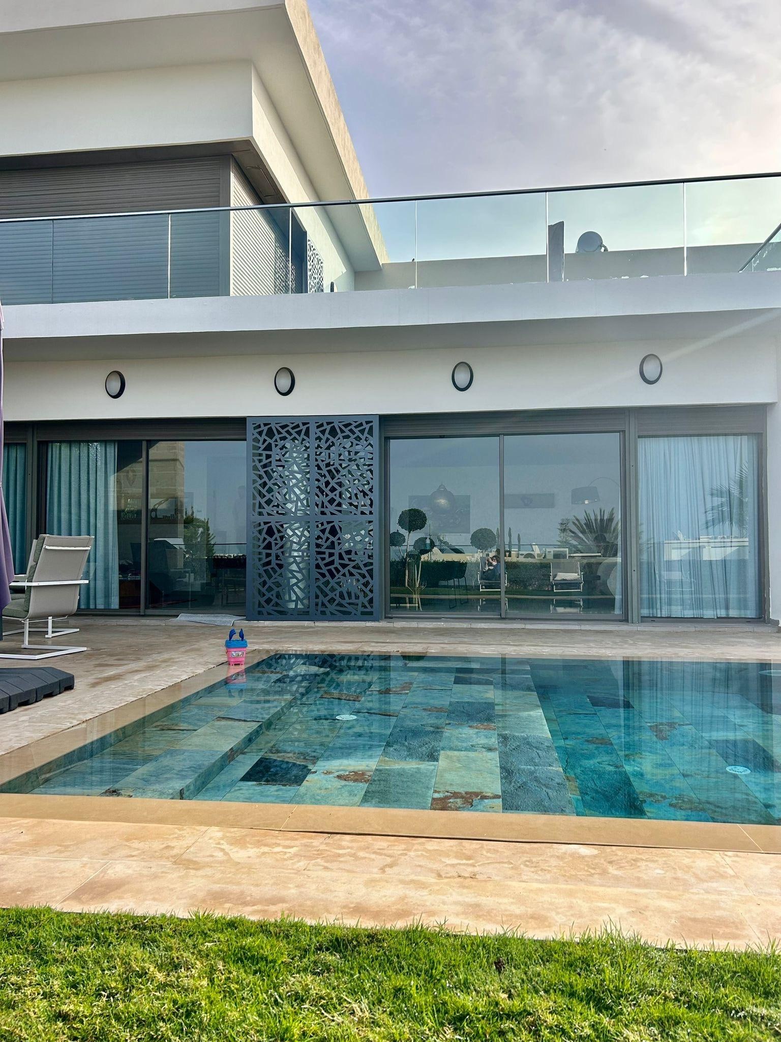 Villa Taghazout bay 119 is a luxurious house for up to 7 guests, featuring 3 bedrooms, 5 beds, and 2 baths. Located in the heart of Taghazout Bay, just a 5-minute walk from the ocean, surrounded by a 27-hole golf course and large hotels. The villa includes a spacious living room with a heated pool and fully equipped terrace, a dining area with Smart TV and IPTV, a fully equipped kitchen, and an office space with a printer. Outside, enjoy a beautifully arranged garden and sunny or shaded terrace.