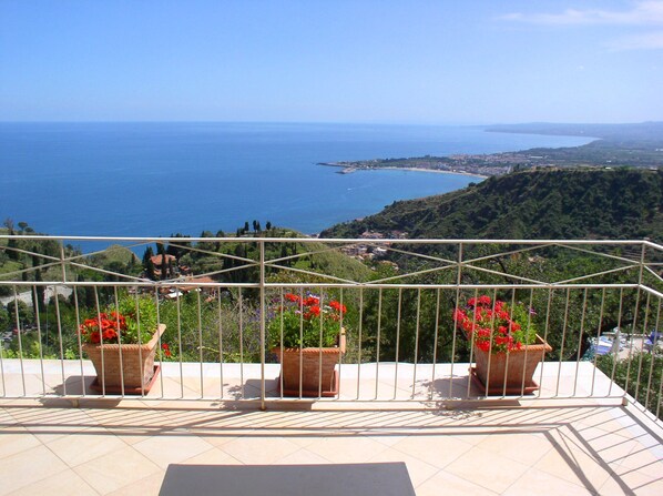 Het appartement "C" heeft een grootte van 163 vierkante meter. (1755 sq. Ft.) Met een terras van 38 vierkante meter (409 sq. Ft.), En bestaat uit: 2 grote slaapkamers en een kleine slaapkamer met 2 eenpersoonsbedden, 1 badkamer met douche, 1 badkamer met douche en bad , een ruime keuken, een grote woonkamer en een terras met uitzicht op de zee en Mt. Etna. Voorzien van verwarming, airconditioning, wasmachine, vaatwasser, magnetrons, WiFi, telefoon, tv (satellietverbinding met BBC World, CNN, ZDF, ARD), kluis, haardroger, broodrooster, koffiezetapparaat, strijkijzer en strijkplank.