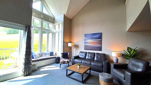 Gelegen op het tweede niveau van het Chateau Ridge-appartementencomplex, biedt dit grote appartement van 1250 vierkante meter met meerdere verdiepingen een spectaculair uitzicht op de berg vanuit de woonkamer op de begane grond. Je kunt zelfs een piek vangen aan het blauwe water van Georgian Bay! Zelfs als je niet van het outdoor-avontuurtype bent, kun je hier nog steeds deel van uitmaken.