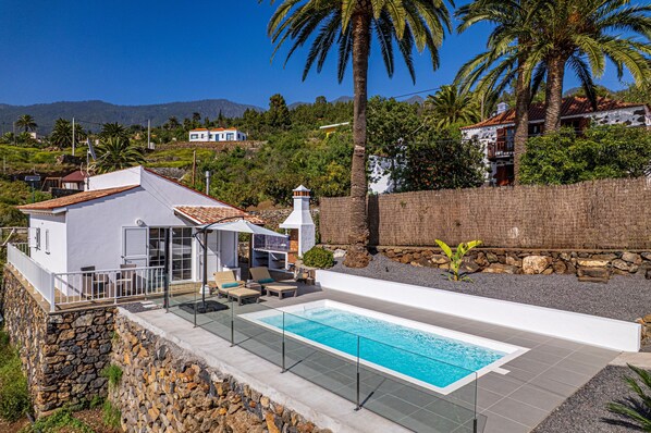 Geniet van de privé tuin met palmbomen, een eigen terras en een privé barbecue om buiten te eten. De woning biedt indrukwekkend uitzicht op zee en bergen, perfect om van de zonsondergang te genieten. Het privé verwarmde zwembad is het hele jaar door beschikbaar en er is een buitendouche voor een complete ervaring.