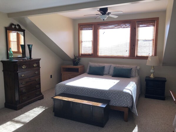 In deze ruime woning vindt u 5 ruime slaapkamers en 3. 5 baden te vinden. Vier slaapkamers en 2. 5 baden zijn op de belangrijkste en tweede verdieping en zijn beschikbaar voor groepen van acht of minder. Groepen van meer dan acht zal ook automatisch toegang tot de slaapkamer en een complete badkamer in de kelder. De toegang tot de kelder slaapkamer met een queen bed en bad kan beschikbaar voor groepen van acht of minder worden gemaakt door het betalen van een vergoeding van $ 50 (voor het geheel van uw verblijf). De eerste verdieping heeft een slaapkamer met een full-size bed en een half bad, en op de tweede verdieping bevinden zich 3 slaapkamers en twee badkamers; een grote slaapkamer (en badkamer) met een queen-size bed, een ander met een full-size bed en een met twee tweelingen. Deze drie slaapkamers zijn ook ingericht met comfortabele futons om te ontspannen en extra slaapruimte (2 doubles en 1 single). De grote badkamer op de tweede verdieping is zeer ruim. Beddengoed en handdoeken zijn aanwezig. Om te genieten van het buitenleven en het uitzicht zijn er 4 portieken / decks. De achterzijde veranda is overdekt en is 25 voet lang op de begane grond. Het is een geweldige plek om te zitten en te ontspannen tijdens het grillen diner! Vanaf daar kunt u het huis van de modder kamer op de begane grond in te voeren. Het voordek is ook behandeld en is 46 voet in lengte. Dit dek is toegankelijk vanuit zowel de woon-en eetkamers op de begane grond en is ingericht met een eettafel en een aantal comfortabele stoelen. De derde buitenruimte is een 10 voet open dek uit de slaapkamer op de 3e verdieping. De woonkamer, eetkamer, keuken en modder kamer zijn allemaal erg groot, wat comfortabele ruimte voor een grote groep biedt. De keuken is volledig uitgerust met een gasfornuis, koelkast, vaatwasser, magnetron, broodrooster, koffiezetapparaat en kookgerei / servies. Koffie en een verscheidenheid van het koken kruiden zijn bedoeld voor uw gemak. We bieden ook een minimale gratis papierproducten (servetten, papieren handdoeken en wc-papier) om u te beginnen op uw verblijf, maar je moet van plan om te kopen / brengen extra met u. De woonkamer is ingericht met een grote, comfortabele, kussen-back banken en een stoel. De love seat en extra grote stoel leunt voor complete ontspanning tijdens het lezen of tv kijken. Er is schotel satelliet en internet service met een flatscreen-tv en dvd-speler voor 's avonds entertainment. De master slaapkamer op de tweede verdieping heeft ook een tv en dvd-speler.