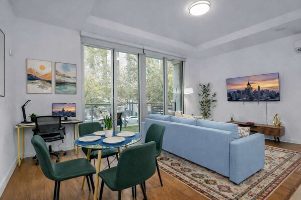 Inside, the open floor plan separates areas for lounging, dining, and working while maintaining a bright, connected feel. The living room features a 65" HDTV, a dedicated desk workspace, and a full-sized sofa bed for additional guests. Reliable WiFi and Ethernet ensure smooth streaming and seamless remote work.