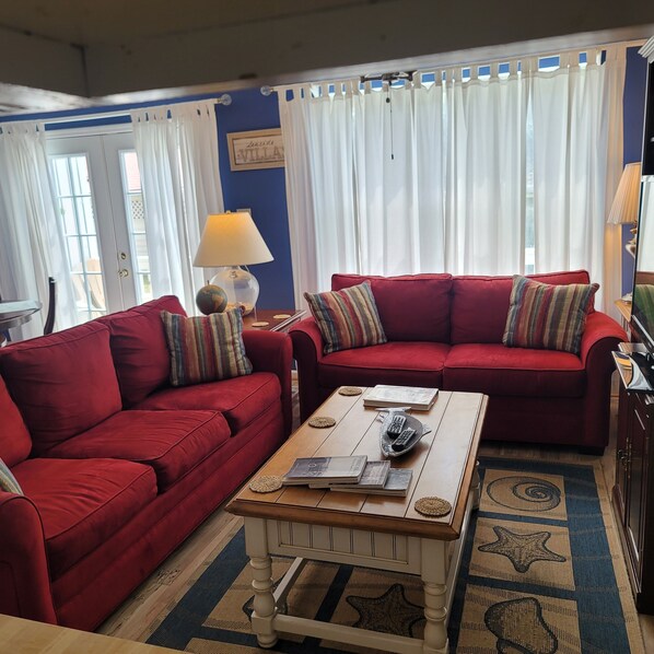 De woonkamer is een open plattegrond met comfortabele zitplaatsen voor iedereen en is ingericht met een flatscreen-tv met videorecorder en dvd, een speeltafel en een achterdek. De keuken is uitgerust met veel borden, roestvrij pot en pannen, broodrooster, koffiepot, magnetron, vaatwasser, fornuis / oven, mixer en nog veel meer. Grenzend aan de keuken is het eetgedeelte, met een eettafel groot genoeg voor iedereen.