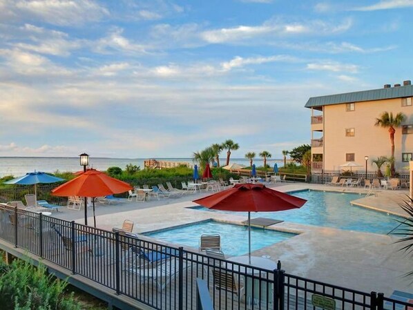 Occupancy: 4 Living area with seating, flatscreen TV, and queen sleeper sofa Full kitchen equipped with full-sized appliances, cookware, and utensils Dining area with seating for 4 Bedroom: Queen bed Additional sleeping space: queen-size sleeper sofa and built in bunk beds (please note these are slightly smaller than average twin size bunks) Full bathroom with a shower-tub combination Private porch with seating Keyless entry Free dedicated parking space Location: Steps from Tybee Island beaches, cafés, shops, and attractions; 25-minute drive to Savannah On-site amenities at Savannah Beach and Racquet Club: gated entry, pool (not heated), private beach access, bike storage, tennis and pickle ball courts