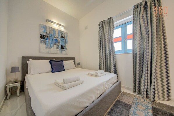 🛏 Main Bedroom | The peaceful bedroom features a comfortable double bed with soft linens, ensuring a restful night’s sleep.