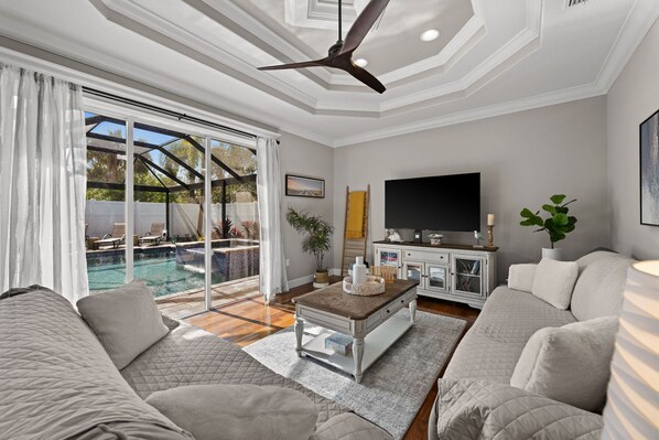 The family room has a 65-inch Smart TV equipped with YouTube TV 2 comfy couches, games and books. The large sliding doors provide direct access to the pool.