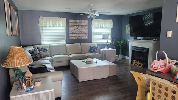 Enjoy a peaceful stay at this 3-bedroom/2 full bath house near Cape May. The fully fenced in backyard is great for kids. It is a superb luxurious property featuring three bedrooms upstairs: 1 King bed, 2 Queen beds, 1 full size bed with extra trundle twin bed and an extra sofa Queen bed downstairs. Sleeps 10 adults. The upstairs and downstairs bathrooms offer convenience, equipped shower tub upstairs and a downstairs shower. Perfect for families or friends traveling together. Experience amenities like two zoned central air conditioning/heating, washer/dryer, large leather sectional sofa and Wifi. A large 75 inch flat screen smart TV in the family room where guests can relax and unwind with Xfinity cable or streaming. Gas stove, fireplace and outdoor gas grill. Enjoy the outdoor lanai with overhead fan, TV and outdoor seating. New Hot Springs Hot tub 7 person capacity in backyard. Towels and bedsheets provided. New GE French door refrigerator with filtered water and ice, new gas stove and oven, Kitchen cookware and utensils , and Keurig coffee maker provided. Experience the magic of Cape May at our welcoming house. Visit local restaraunts: Lucky Bones, Lobster House, Cape May zoo, Cape May beach, and Beach Plum farm, Washington street mall, and local breweries and wineries. Close proximty to Wildwood so you can enjoy the boardwalk and amusements with your children.