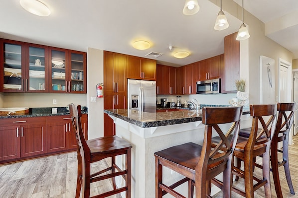 After a fun day at the beach, unwind in the primary suite, which features a private entrance to the beautiful balconies, a TV, and a spacious bathroom with granite and tile finishes. The second bedroom also includes a TV for your convenience. Your younger beachgoers will love the third bunk bedroom, equipped with twin-over-double bunk beds and a TV. Don’t forget to bring your game console, games, and gadgets—free cable and WiFi are provided for your enjoyment!