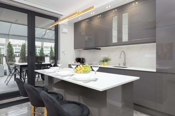 Oven, dishwasher, induction hob, extractor hood, fridge with freezer, electric kettle, microwave, capsule coffee machine, kitchen and dining utensils, wine glasses, kitchen island with chairs