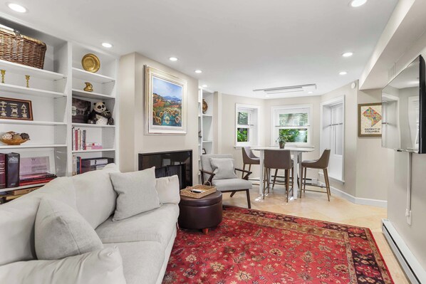 Living room: Relax in your welcoming living room with a comfortable sofa bed, warm décor, a soft area rug, and a charming decorative fireplace. Enjoy the wall-mounted TV, browse books on the built-in shelves, or gather in the inviting dining area for meals and conversation.