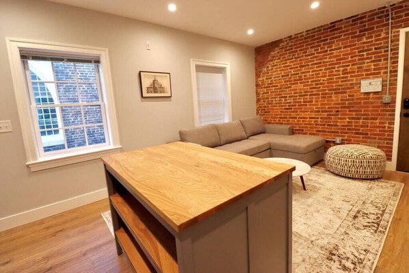 The Space: Located on the second floor and delighted with everything you need for a relaxing stay for four, the King Suite is appointed with one bedroom, a queen-sized bed and large desk. The living space is furnished with a large sofa bed. Watch cable or login to your favorite streaming service on the 40" flat screen TV. The kitchenette is equipped with cooking basics, a full-size refrigerator, dishwasher, microwave, 2-burner electric cooktop, and Nespresso coffee maker. Hair dryer and handheld steamer included in each suite and laundry facilities in the building are available to all guests.