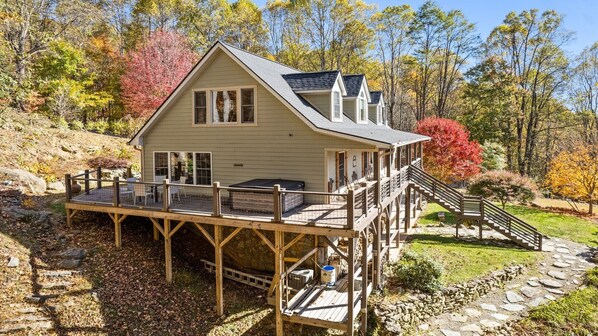 Perhaps the best features of this luxury cabin are the outdoor living spaces! The fabulous wraparound porch with a private hot tub will melt your stress away. Enjoy outdoor dining with a magnificent view! Below, you'll see our cozy fire pit right beside the the rushing creek on the property, complete with a waterfall. This space is sure to provide an unforgettable experience!